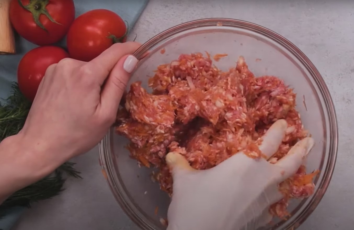 Przeciśnij czosnek przez praskę i dodaj go do mięsa razem z marchewką i jajkiem. Dodaj przyprawy i całość wymieszaj.