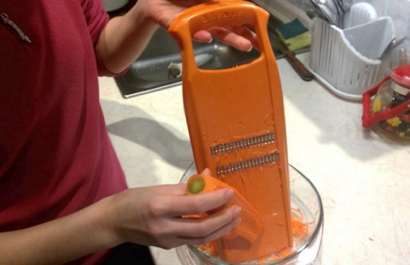 Marchew należy dokładnie umyć i obrać. Ścieramy ją na specjalnym tarle – potrzebne będą jak najdłuższe, cienkie paseczki.