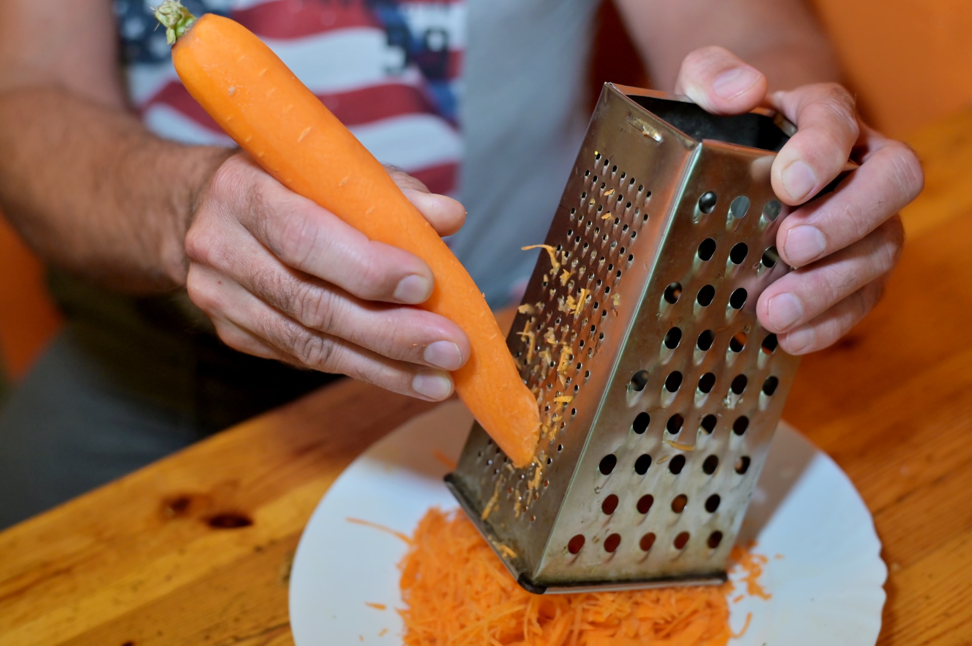 Warzywa myjemy dokładnie, po czym ścieramy na tarce. Drobno ścieramy marchew, siekamy pora (możesz też go pominąć).