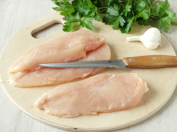 Kurczaka należy opłukać i osuszyć papierowym ręcznikiem. Mięso kroimy na cienkie kotleciki, po czym przykrywamy je folią spożywczą i tłuczemy je na cienkie kotleciki.
