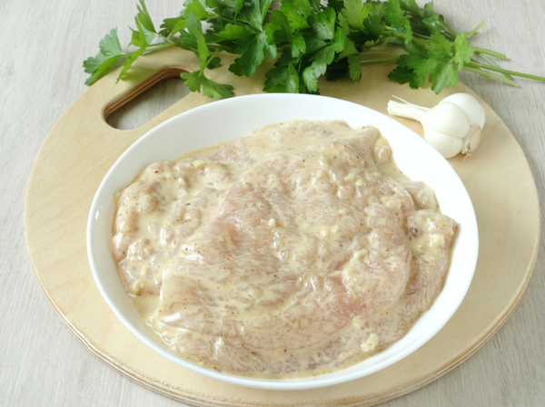 Potem całość zalewamy marynatą i odstawiamy w ten sposób do lodówki na 1-2 godziny. Przygotowujemy blachę, którą należy wyłożyć pergaminem. Na nią to wykładamy marynowane kotlety.