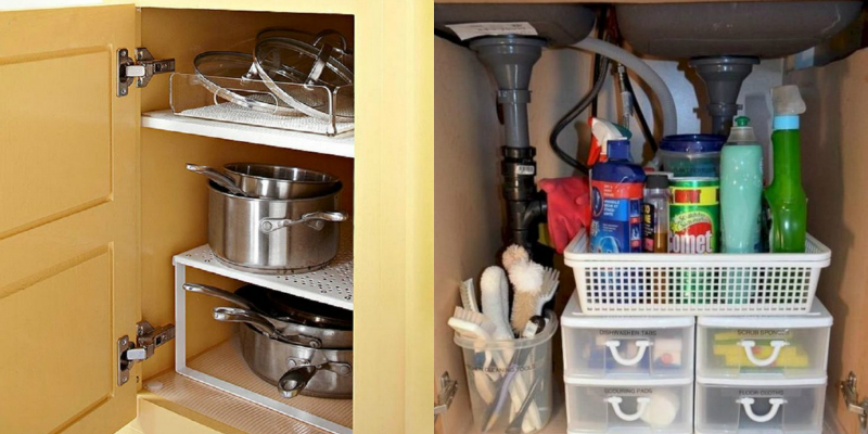 Zagospodarowanie każdej, wolnej przestrzeni w kuchni pozwoli na uporządkowanie wszystkich przedmiotów kuchennych. Za pomocą specjalnych organizerów, które są dostępne w większości sklepów, można wykorzystać także przestrzeń w wysokich szafkach.