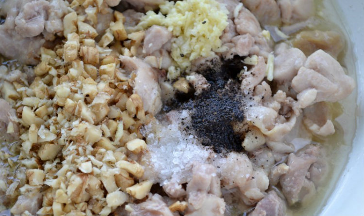 W misce ułóż oddzielone od kości mięso, dodaj przeciśnięty przez praskę czosnek i podprażone orzechy. W razie potrzeby dopraw do smaku.