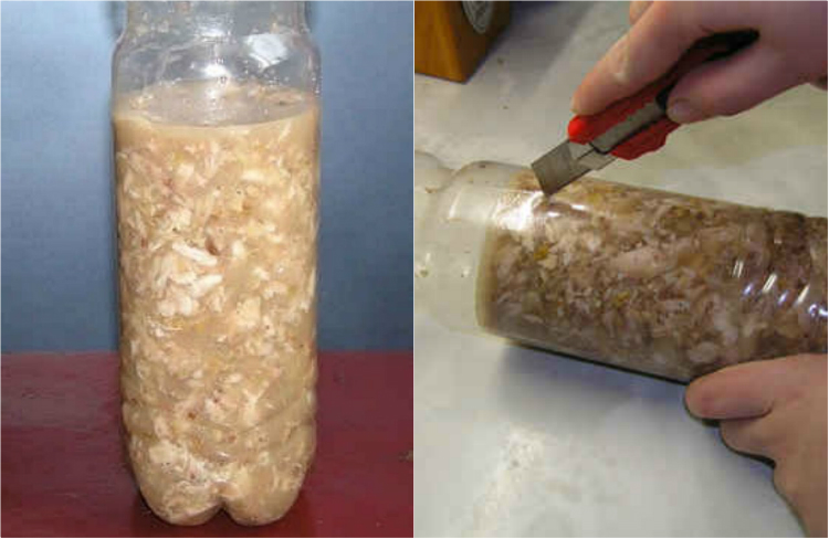 Przygotuj czystą, plastikową butelkę o pojemności 1,5 litra i odetnij jej szyjkę. Napełnij butelkę schłodzoną masą mięsa z dodatkami i włóż do lodówki na kilka godzin. Zawartość butelki powinna całkowicie stężeć.