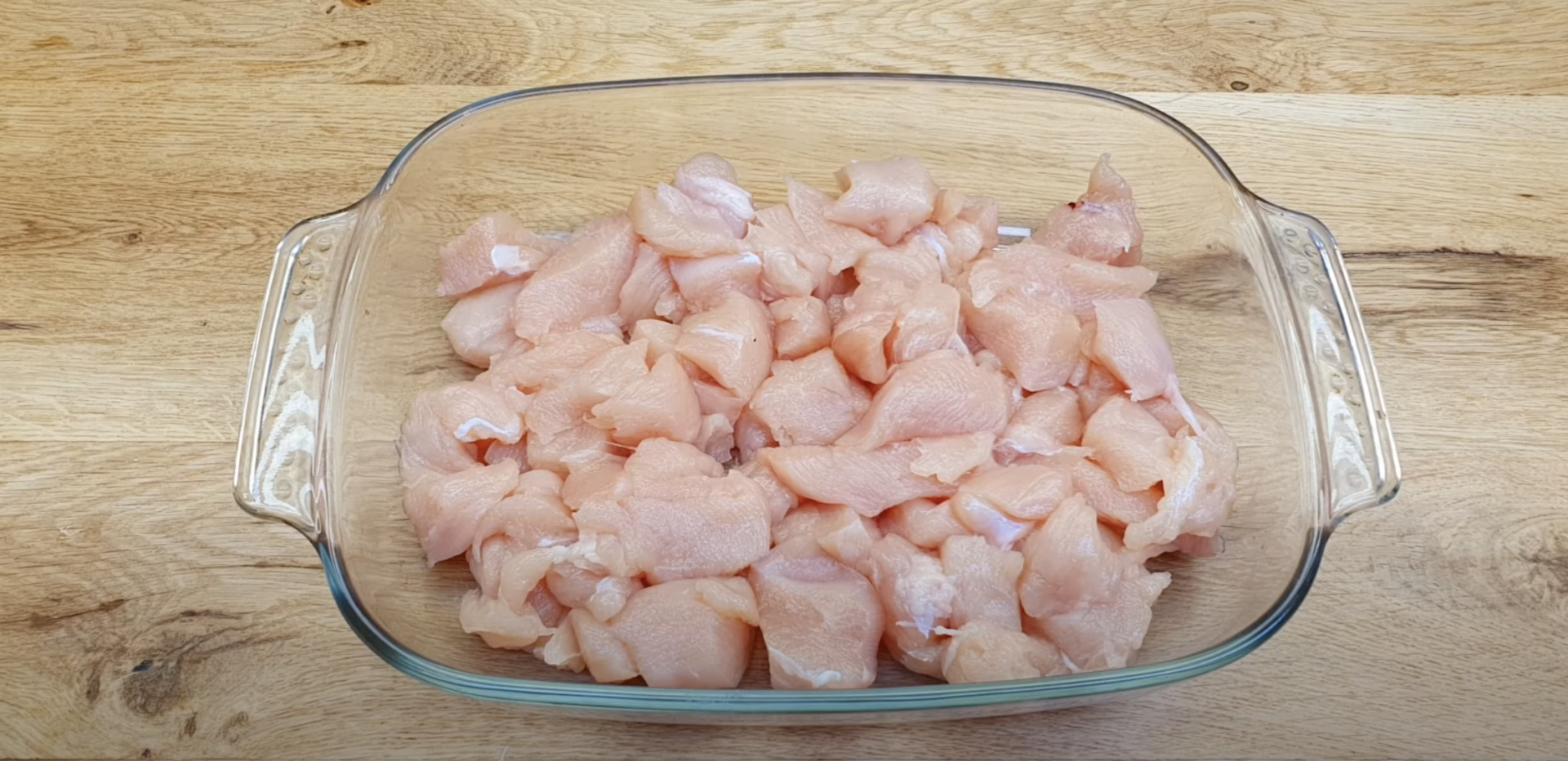 W pierwszej kolejności należy umyć, osuszyć pierś z kurczaka. Następnie pierś z kurczaka należy pokroić w kostkę i całość posypać dokładnie solą.