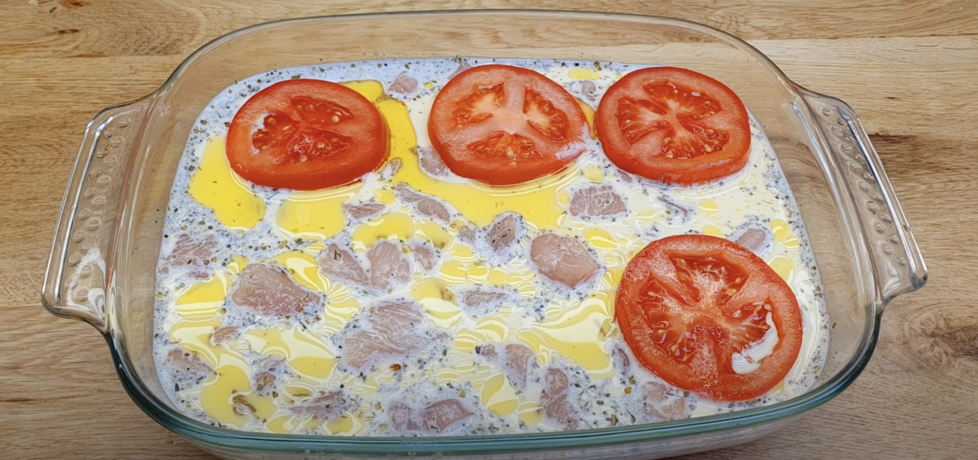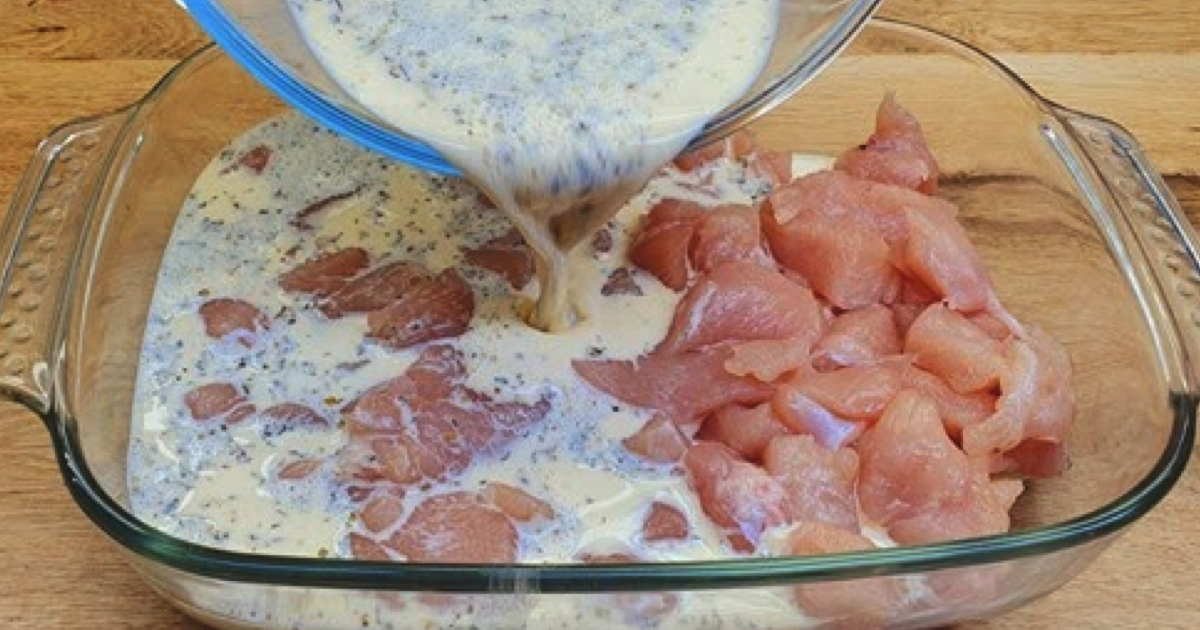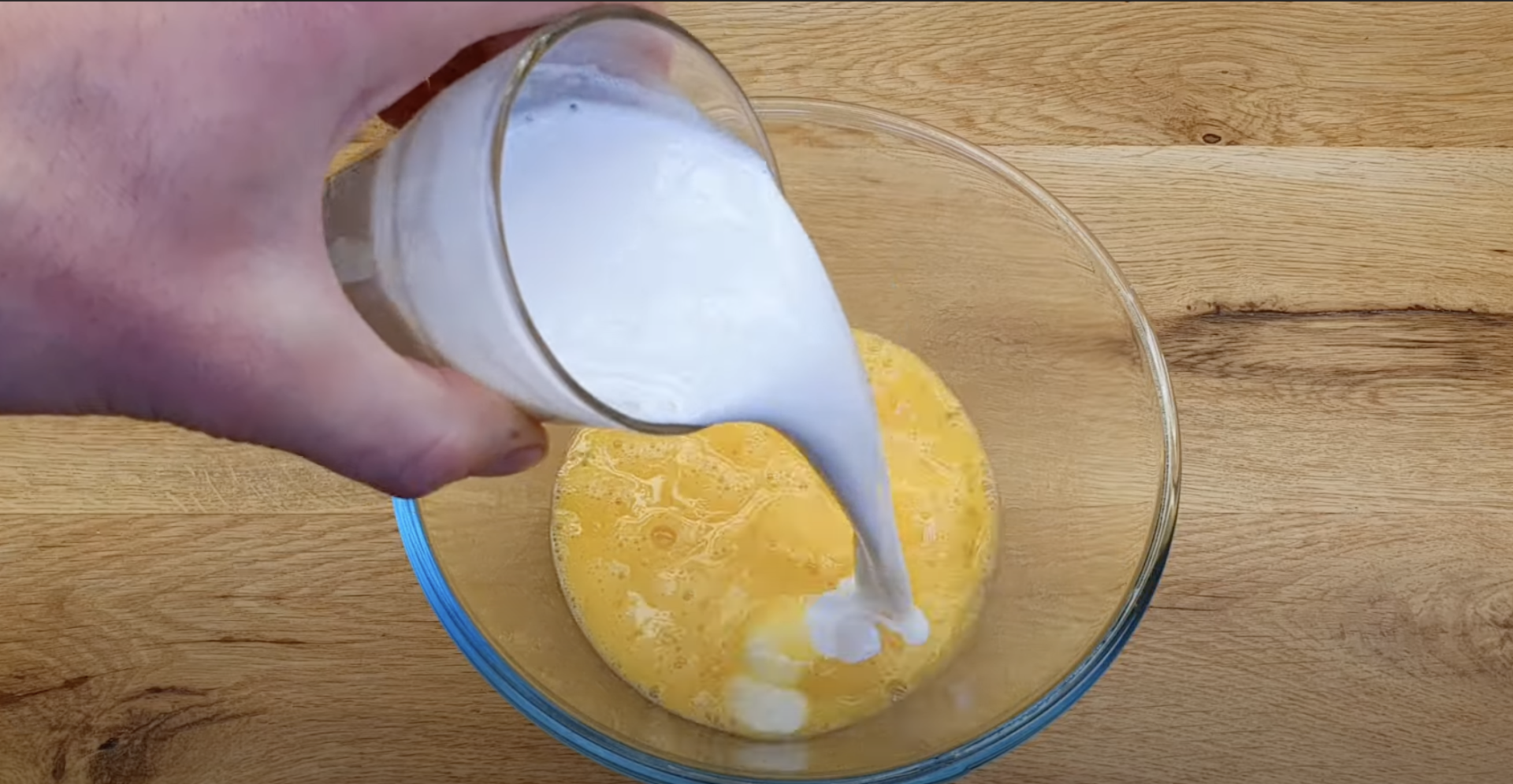 Do jajek dodaj śmietanę i przyprawy. Zawartość miski dokładnie wymieszaj. Sos z miski przelej do naczynia żaroodpornego, w którym jest pokrojony kurczak.