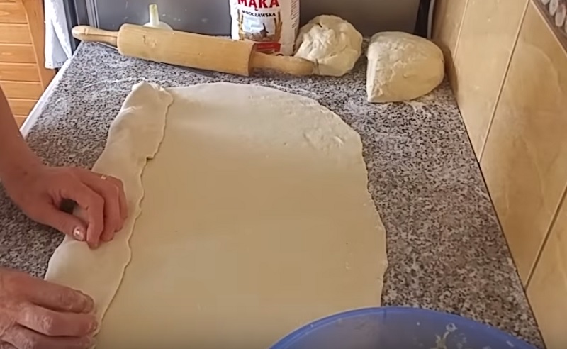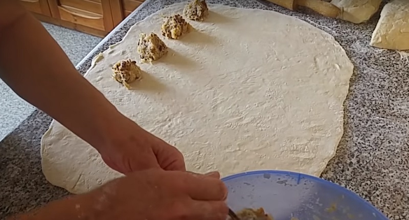 Najpierw delikatnie rozwałkuj ciasto i posyp je mąką. Następnie od około 5-7 cm od krawędzi ciasta należy ułożyć kulki z farszu.