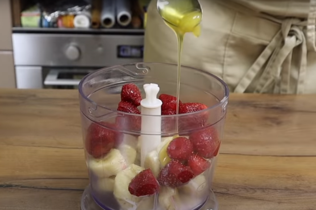 Podstawowe lody bananowe są gotowe. Teraz możesz dodać do nich ulubione składniki. Aby uzyskać lody truskawkowe, postępuj w następujący sposób. Mrożone banany wymieszamy z miodem, mlekiem roślinnym i świeżymi truskawkami.