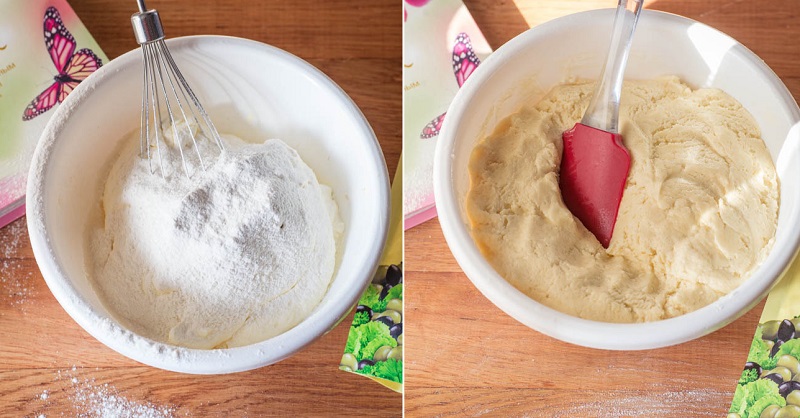 Przesiej mąkę i proszek do pieczenia do płynnej mieszanki i zagnieć gładkie ciasto. Przenieś je do szprycy cukierniczej lub plastikowej torebki i wytnij dziurkę w jej rogu.