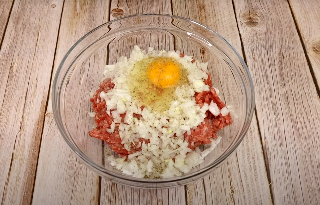 1 cebulę obierz i drobno posiekaj, dodaj do mielonego mięsa. Wbij jajko, przypraw i wymieszaj.