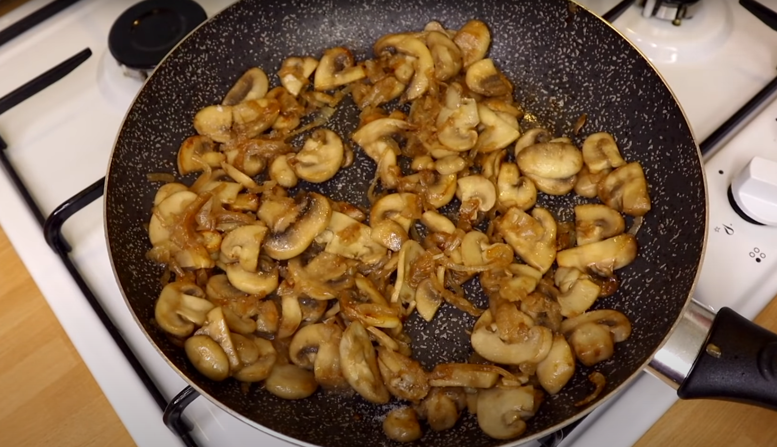 Drugą cebulę umyj, pokrój na mniejsze półpierścienie i podsmaż na patelni z odrobiną oleju. Dodaj pokrojone w plasterki pieczarki i duś razem na średnim ogniu. W międzyczasie zetrzyj twardy ser na tarce o dużych oczkach.