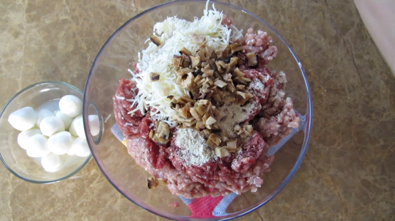 Pieczarki należy drobno posiekać. Do jednej miski wrzucamy mięso mielone razem z posiekanymi pieczarkami, solą, pieprzem. Pietruszkę również należy bardzo drobno posiekać. Ser należy zetrzeć przy pomocy tarki.