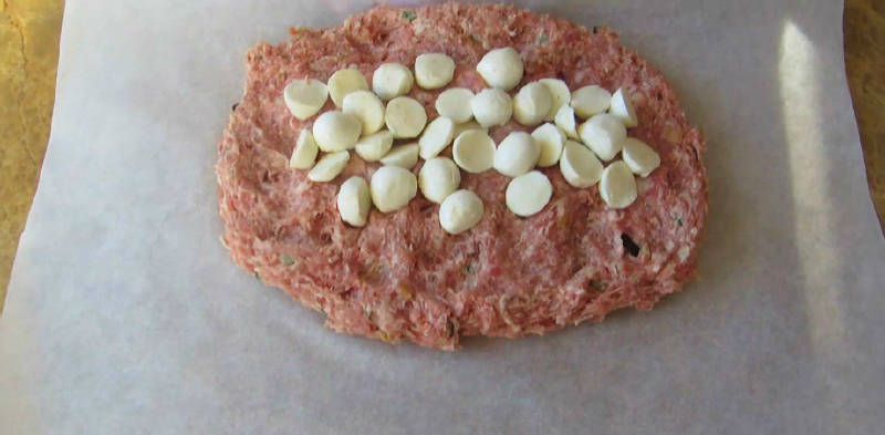 Mięso powinno mieć coś na kształt prostokąta, na środku którego należy ułożyć małe plasterki mozzarelli. Powoli zwijamy krawędzie papieru w taki sposób, aby z mięsa zrobić rulon.