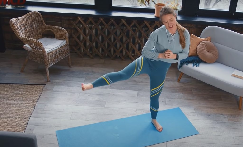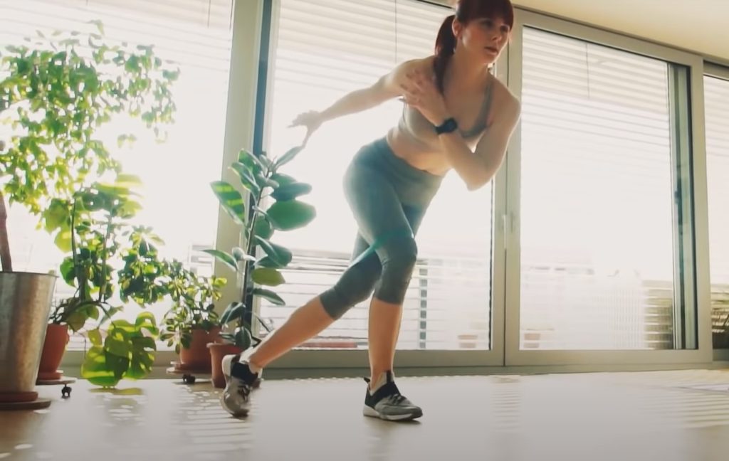 Kolejne ćwiczenie, które wykonujemy przez 30 sekund. Do tego ćwiczenia zaleca się użycie gumy fitness, zakładając ją na biodra. Samo ćwiczenie polega na przeskakiwaniu z jednej nogi na drugą, wyciągając jedną nogę w tył po skosie. W tej chwili należy zawsze dotykać z przodu ręką przeciwległego ramienia. Pamiętać o tym, żeby plecy było proste. Mięśnie muszą być napięcie.