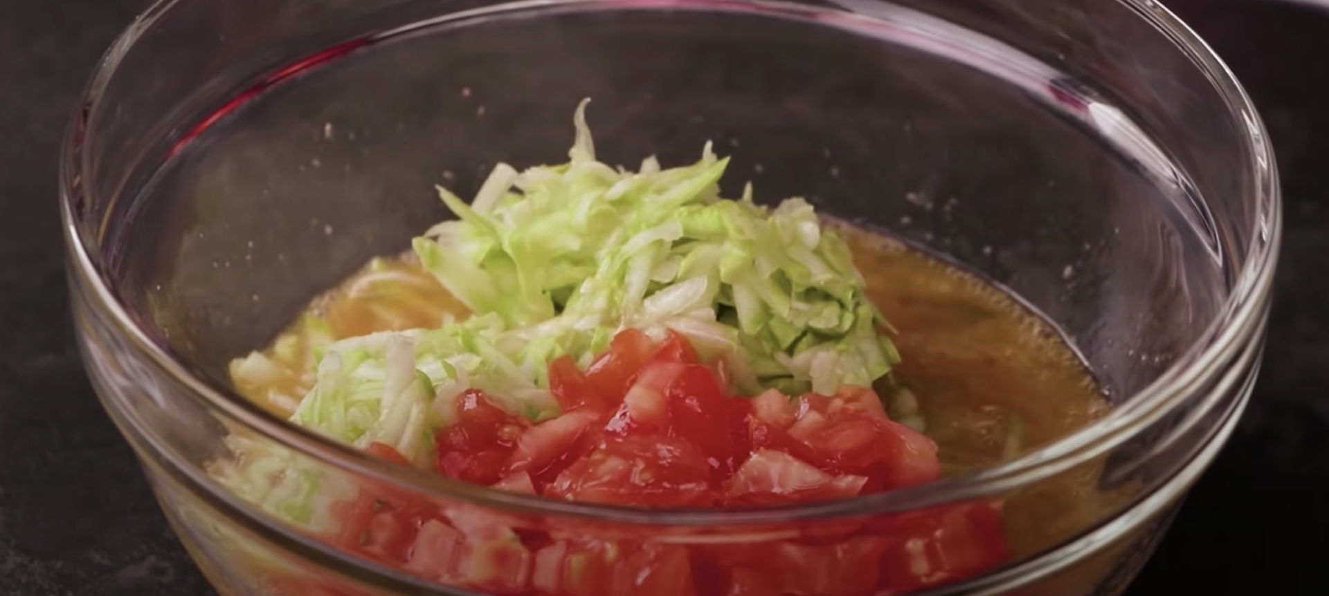 Dodać starty ser i wymieszać. Pomidory pokroić na małe kawałki i dodać do mieszanki.