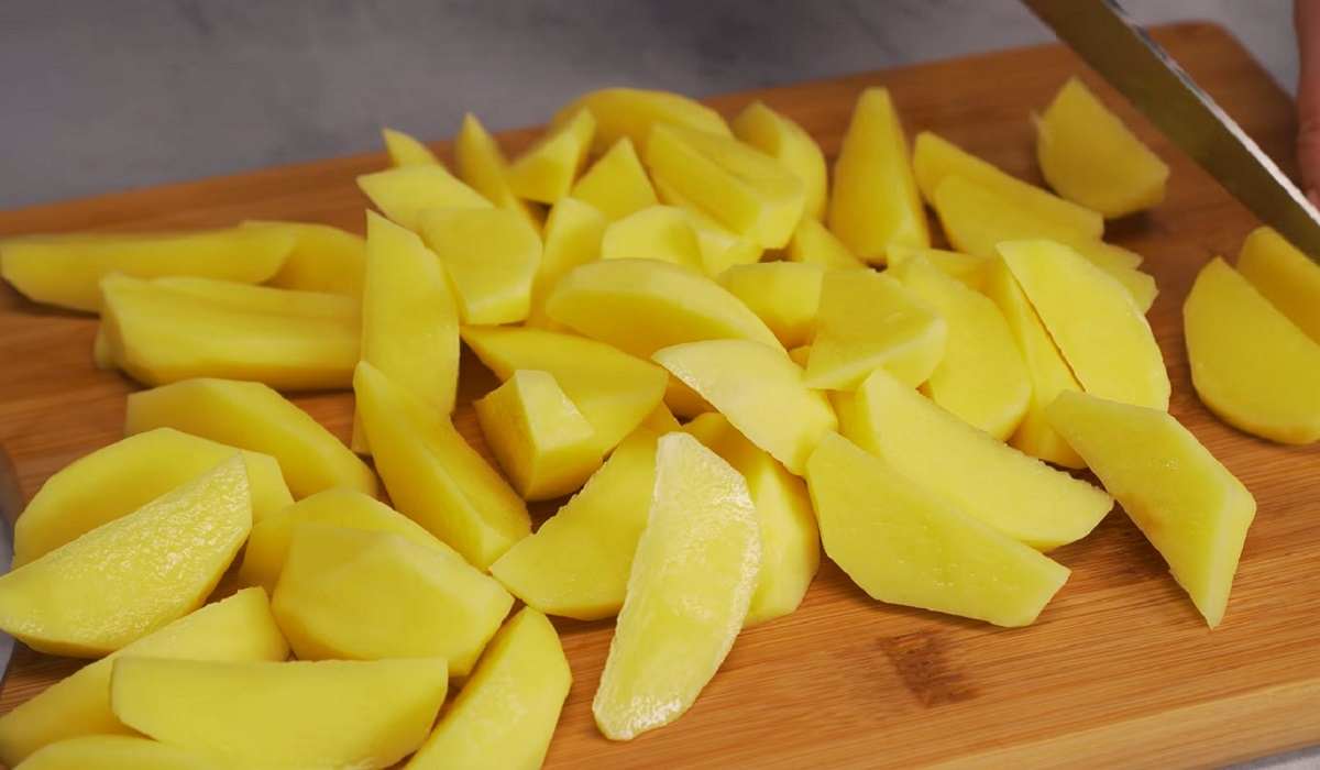 Obierz ziemniaki i pokrój je w kostkę. Gotuj do miękkości przez około 15 minut.