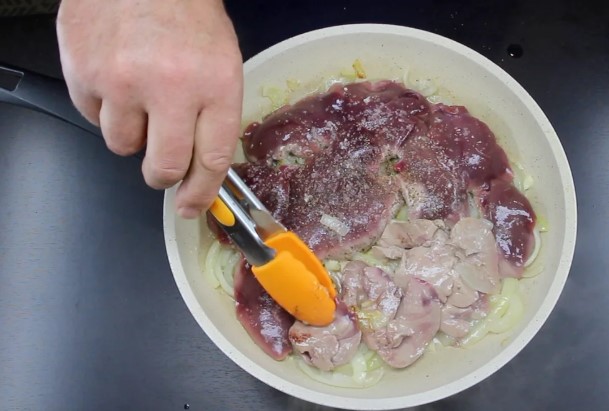 Na naszej cebuli układamy oczyszczoną, pokrojoną na kawałki wątróbkę. Doprawiamy wszystko świeżo zmielonym czarnym pieprzem. Sól dodajemy dopiero pod koniec smażenia. Nigdy nie robimy tego wcześniej, bo nasza wątróbka stwardnieje.