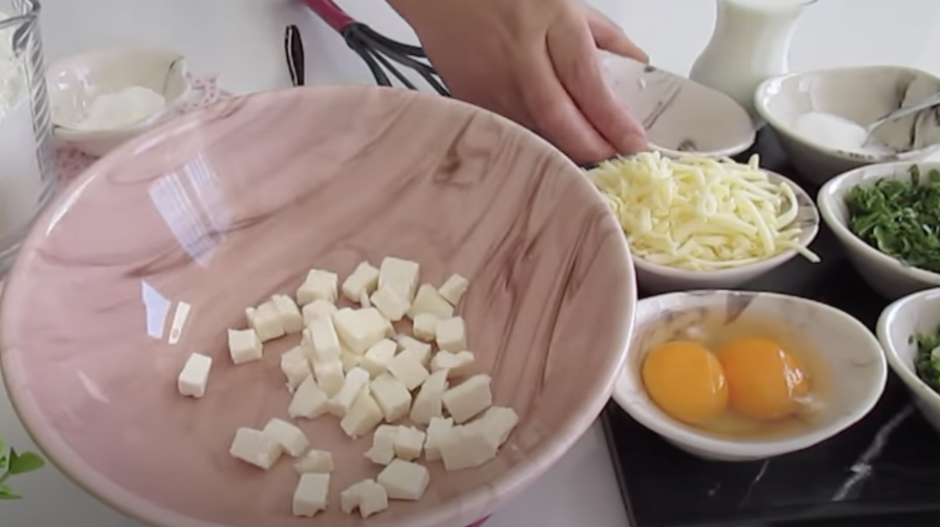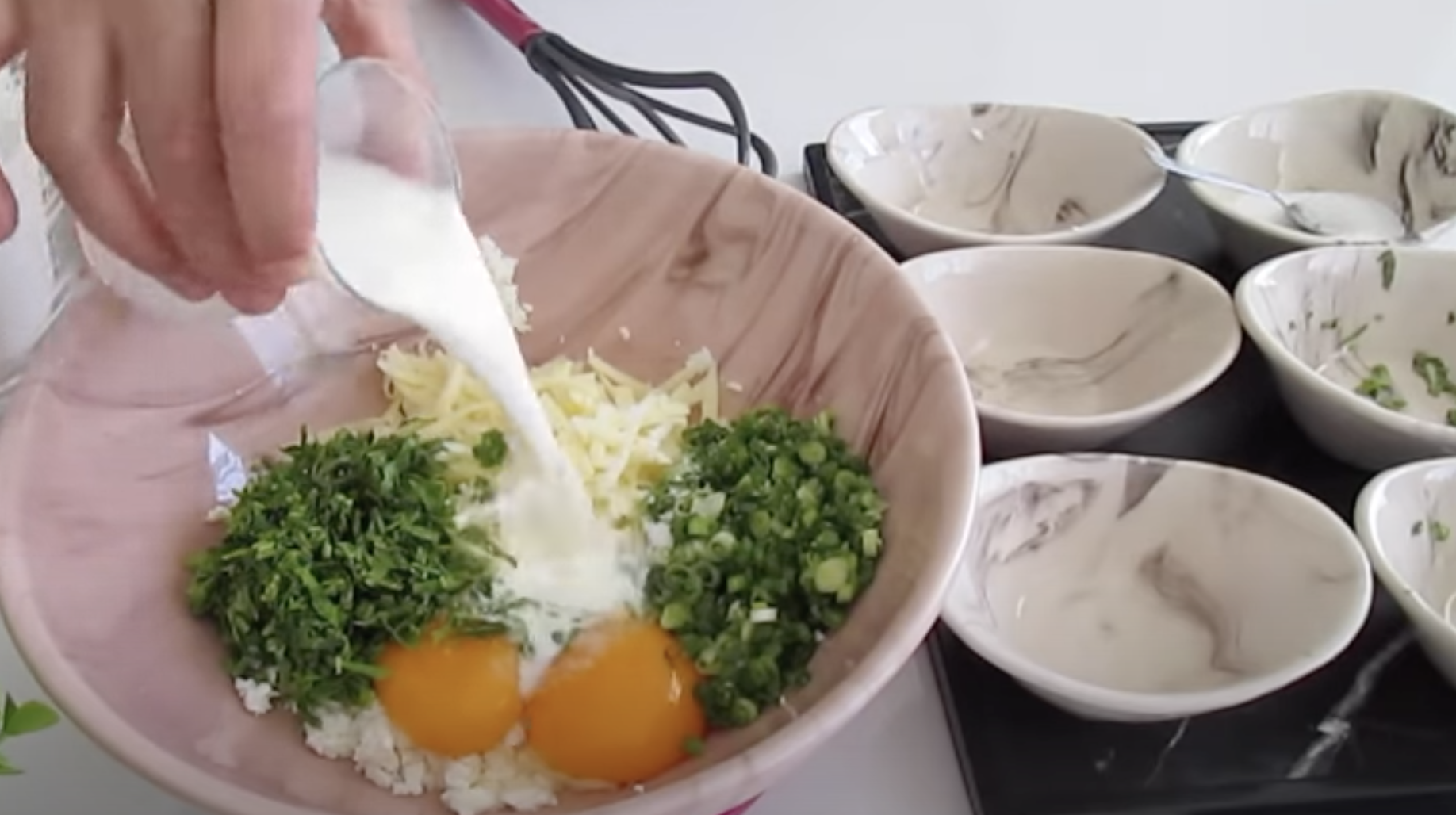 W dużej misce wymieszaj roztarty ser, starty twardy ser, mleko jajka oraz posiekaną pietruszkę i szczypiorek. Następnie dodaj mąkę z proszkiem do pieczenia.