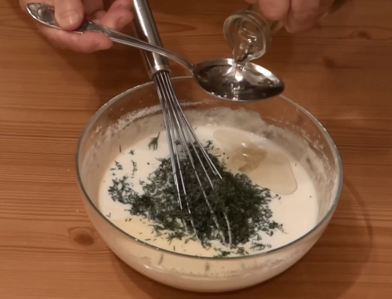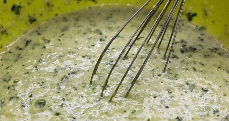Do miski, w której ucieraliśmy cukinię, wlewamy ciasto, dodajemy posiekane zioła i dwie łyżki oleju. Wszystko dokładnie mieszamy do momentu uzyskania gładkiej masy.