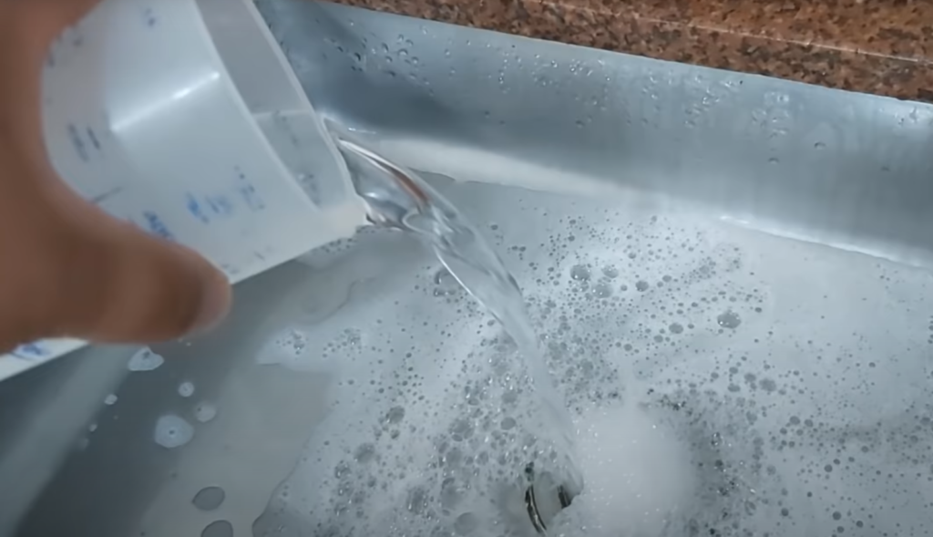 - Wlej najpierw 1 szklankę sody do odpływu i zalej ją wrzątkiem.