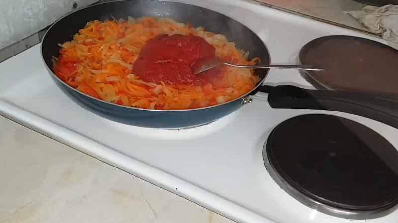 Mieszaninę na patelni podziel na dwie części, po czym jedną z nich dodaj do ryżu z mięsem. Do pozostawionej części warzyw na patelni, dodaj około pół litra wody, dopraw solą i pieprzem. Mieszaninę na patelni należy doprowadzić do wrzenia, a następnie ostudzić.