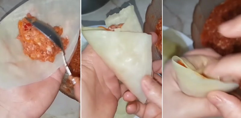 Teraz zajmijmy się nadzieniem do gołąbków. Po dokładnym go wymieszaniu, włóż odrobinę na liść kapusty i złóż go w trójkąt, chowając górną część liścia do środka.