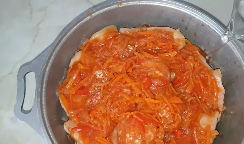 Gdy wszystkie warstwy zostaną ułożone, gołąbki zalej od góry pozostałym sosem. Do garnka dolej pół litra wody i gotuj na wolnym ogniu.