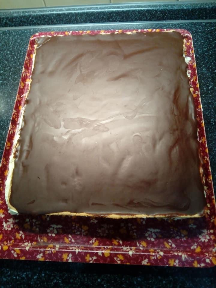 Nasącz biszkopty i ułóż je obok siebie. Na biszkopty wyłóż drugą połowę kremu i przykryj drugim blatem ciasta. Całość zważ i odstaw do lodówki na noc.
