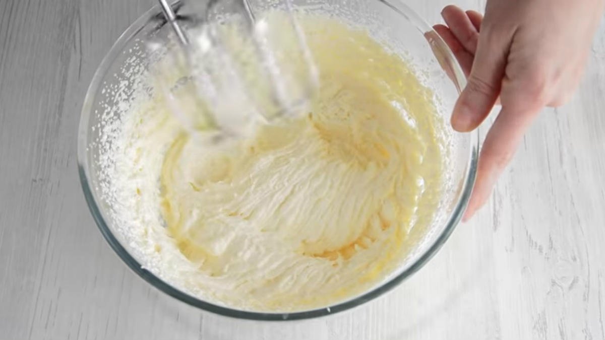 Połącz masło i cukier z solą. Tę mieszankę należy ubijać mikserem przez około 5 minut. Dodawaj jajka po jednym, aż uzyskasz gładką masę.