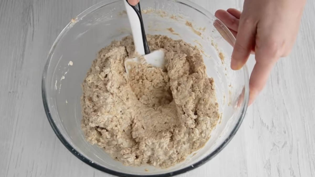 Mąkę należy przesiać. Dodać proszek, płatki owsiane i cynamon. Mieszankę mąki i proszku należy dodać do masy. Połączyć składniki, aż powstanie miękkie ciasto.