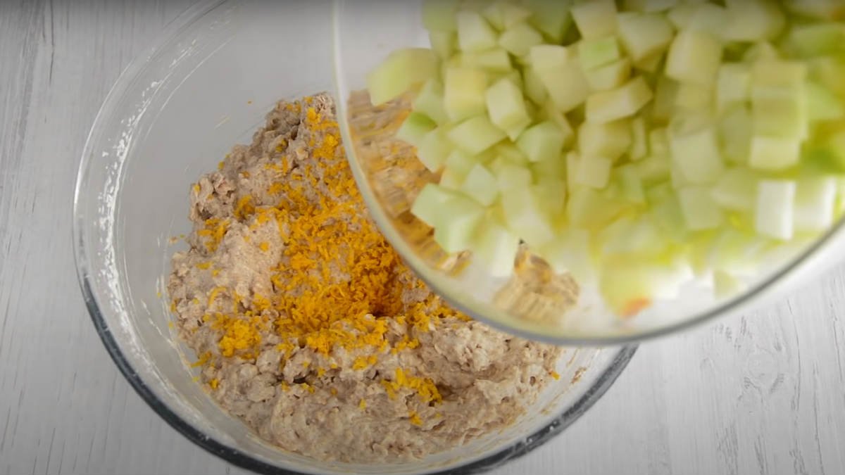 Następnie obrać jabłka i pokroić je w drobną kostkę. Lekko skrop jabłka sokiem z cytryny. Nie zapomnij o skórce startej z cytryny. Następnie dodaj skórkę z jabłek i jabłka do ciasta. Rozłóż ciasto na blasze do pieczenia i ułóż je w równej warstwie.