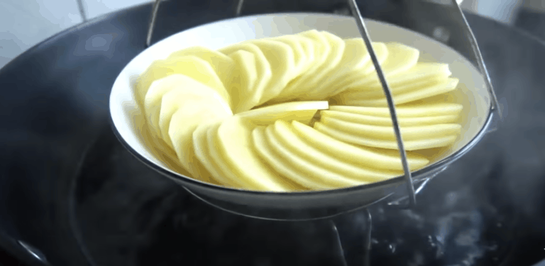 Pierwszym krokiem jest obranie ziemniaków lub ziemniaka i pokrojenie w drobne plasterki. Po obraniu powinny być gotowane na parze przez 20 minut lub jeśli nie ma się takiej możliwości to w sposób klasyczny.