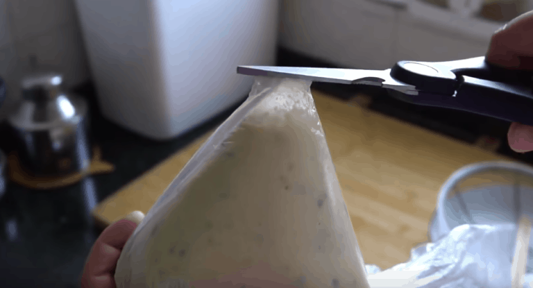 Po tym czasie co ciasta dodajemy szczypiorek i ciasto przekładamy do woreczka foliowego, w którym odcinamy końcówkę.