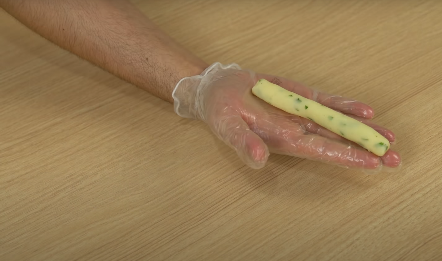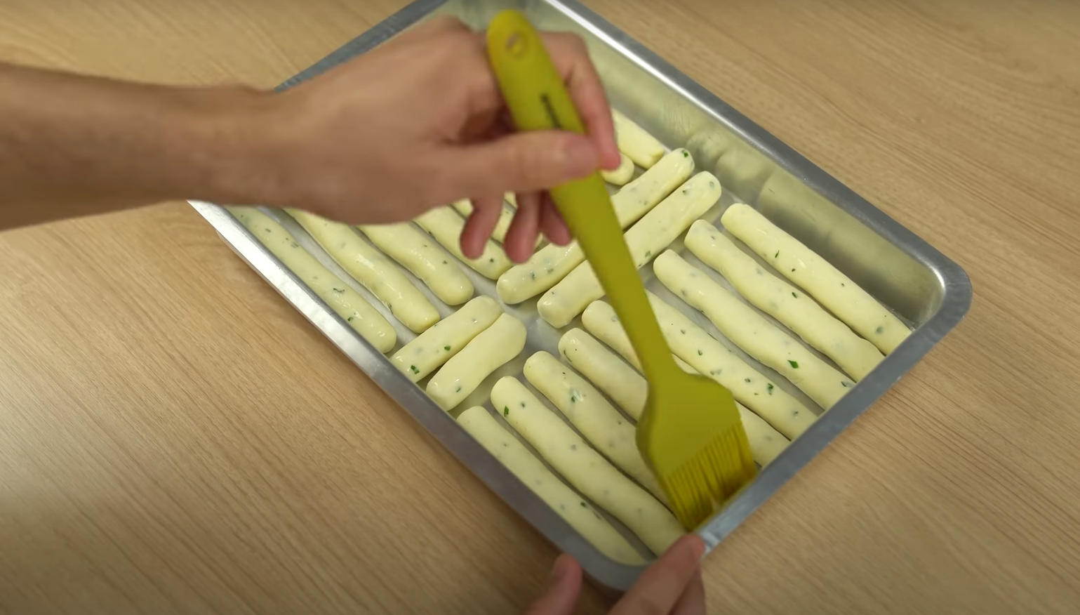 Wszystko dobrze wymieszaj, aż powstanie zwarte ciasto. Jeśli po wymieszaniu ciasto przykleja się do dłoni, dodaj więcej skrobi. Teraz uformuj z masy średniej grubości paluszki.