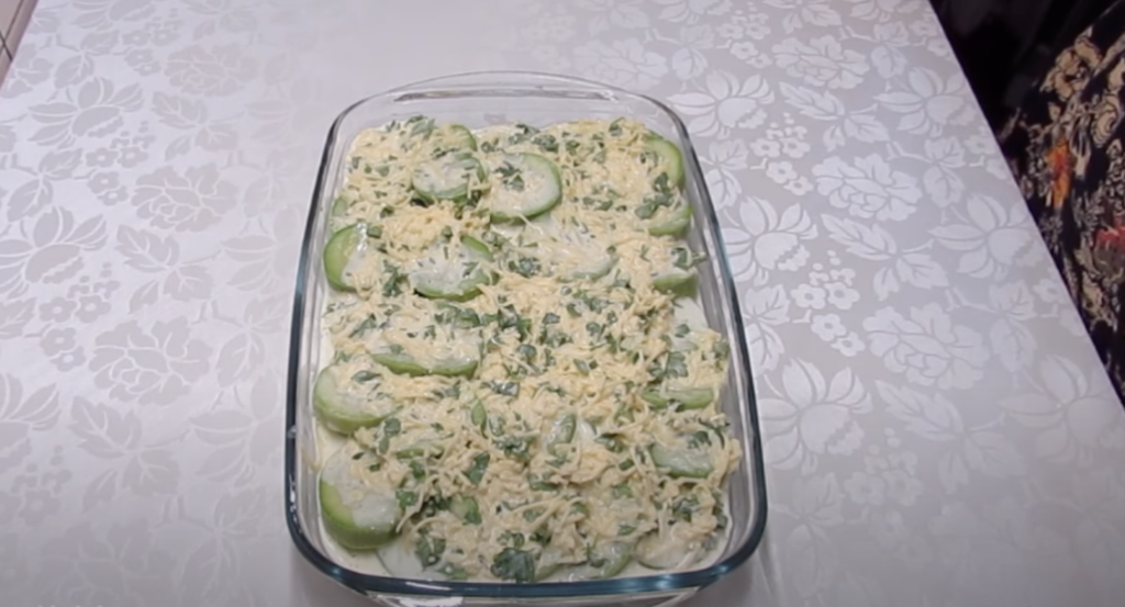 Równomiernie wyłóż połowę cukinii do formy do pieczenia.