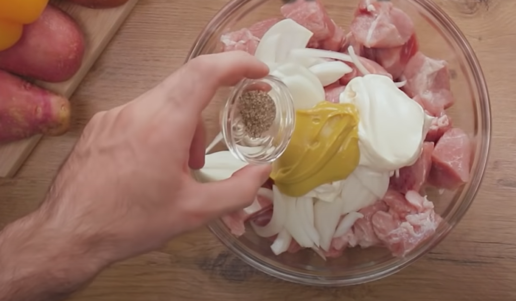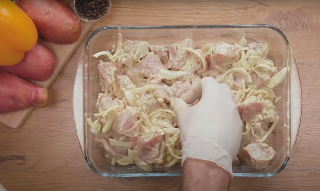 Mięso kroimy na średniej wielkości kawałki, wkładamy do miski, dodajemy 100 g majonezu i musztardy. Sól, dopraw i dobrze wymieszaj.