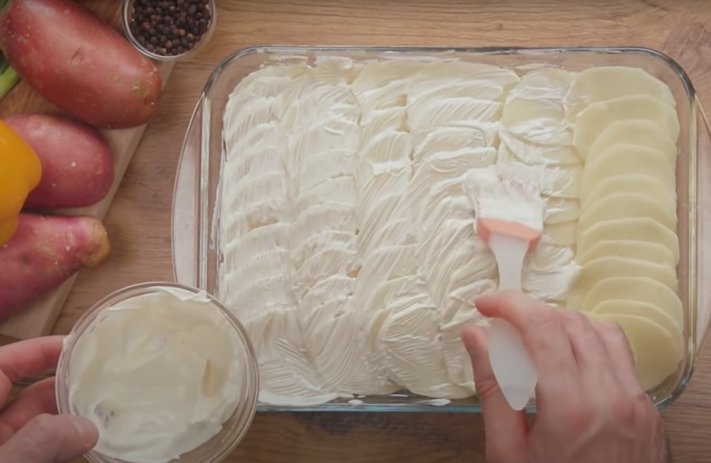 Na koniec mieszamy ogórki kiszone, które ścieramy na grubej tarce. Wszystko dobrze wymieszaj ręcznie, aby połączyć smaki i warstwy w naczyniu do pieczenia.