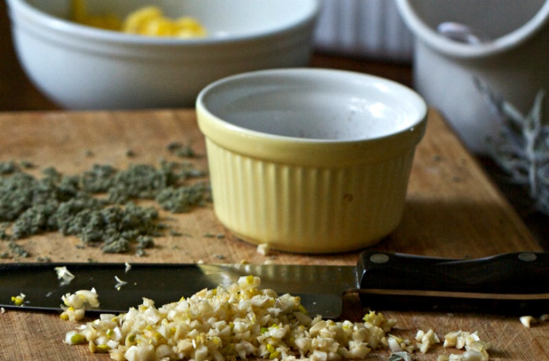 Tu przy pomocy blendera wymieszaj takie składniki jak parę gałązek mięty i kolendry, ząbek czosnku, odrobinę świeżego imbiru, trochę papryki chili, a także sok z limonki. Do mieszaniny dodaj masło oraz sól i pieprz do smaku.