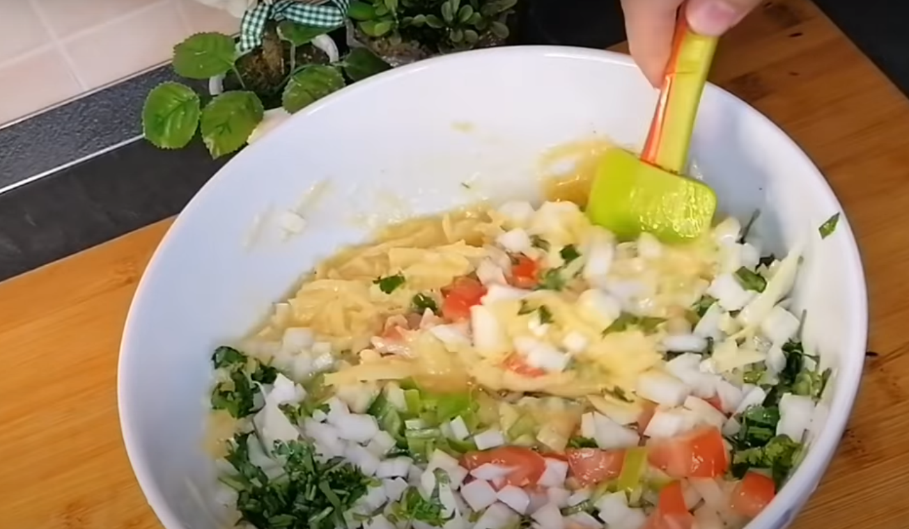 Do oddzielnej miski wbić cztery jajka, dodać sól, pieprz, mleko i oliwę. Następnie dołożyć do tego starte ziemniaki i pokrojone warzywa. Starannie wymieszać.