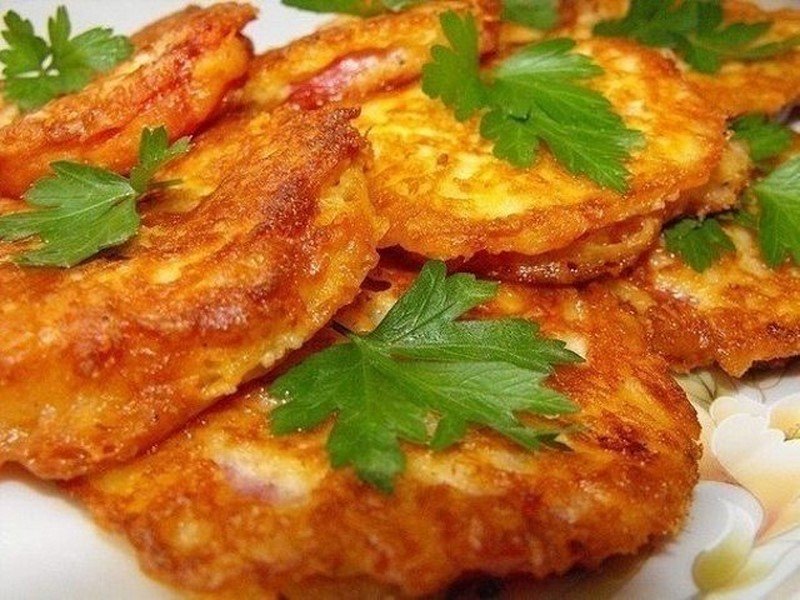 Zaczynamy smażyć. Bierzemy jeden plaster pomidora i obtaczamy kolejno w mące, jajku i panierce z serem. Kładziemy tak przygotowane warzywo na patelni i smażymy do uzyskania złotego koloru z obu stron.