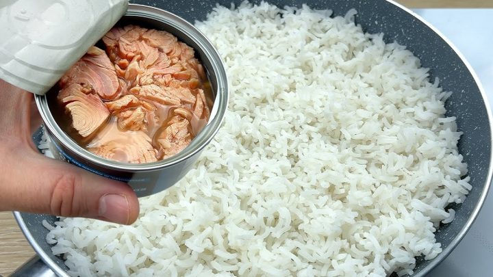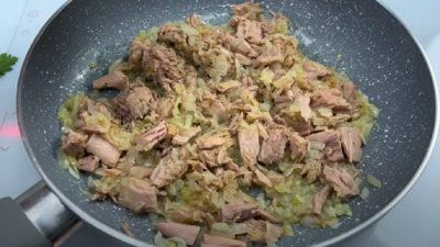 Do osolonego wrzątku wsypujemy opłukany ryż – zajmie to około 20 minut. Podczas gotowania ryżu obierz i drobno posiekaj cebulę. Ugotowany ryż odcedź i odłóż na bok. Na patelni rozgrzewamy olej i podsmażamy na nim cebulę. Do podsmażonej cebuli dodajemy tuńczyka z puszki bez soku. Wymieszaj składniki i smaż przez 7 minut.