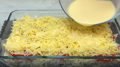 W misce ubić jajka ze śmietaną. Zetrzyj twardy ser na mieszaninę w naczyniu do pieczenia i polej wszystko sosem jajecznym. Pudding ryżowy z tuńczykiem pieczemy w piekarniku nagrzanym do 180°C przez 15 minut.