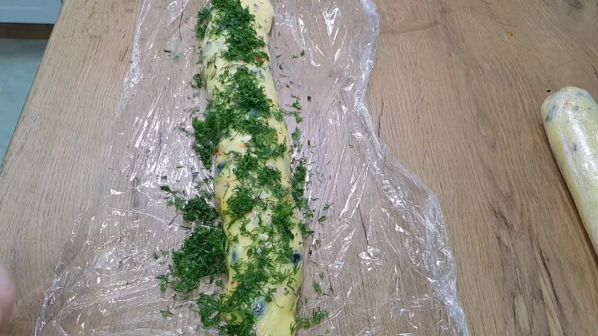 Posyp ziołami drugą część masy, szczelnie ją zamknij i owiń folią spożywczą, po czym wstaw do lodówki na minimum 2 godziny.