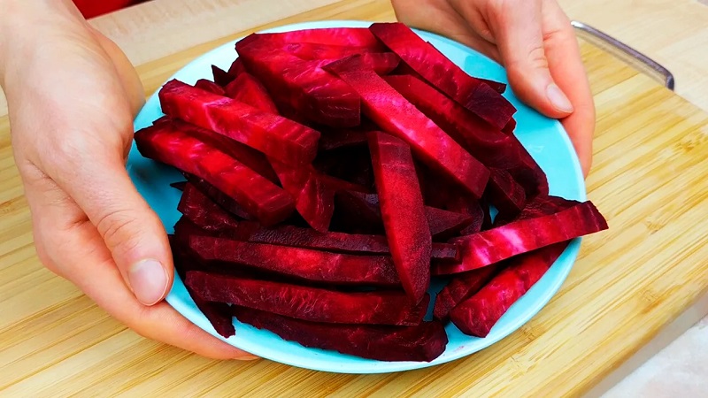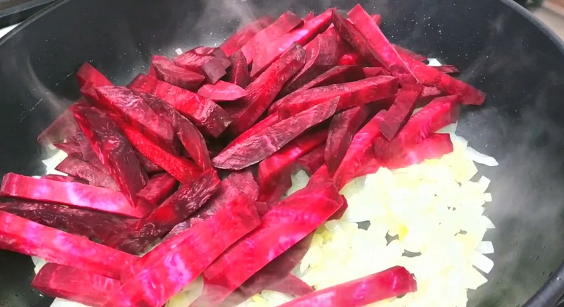 Cebulę pokrój w drobną kostkę. Na patelni rozgrzej olej, wrzuć cebulkę na około 2 minuty do lekkiego podsmażenia. Wcześniej przygotuj buraki: najpierw pokrój je w plasterki, a następnie w słupki. Dodaj do cebuli i podsmażaj przez krótką chwilę.