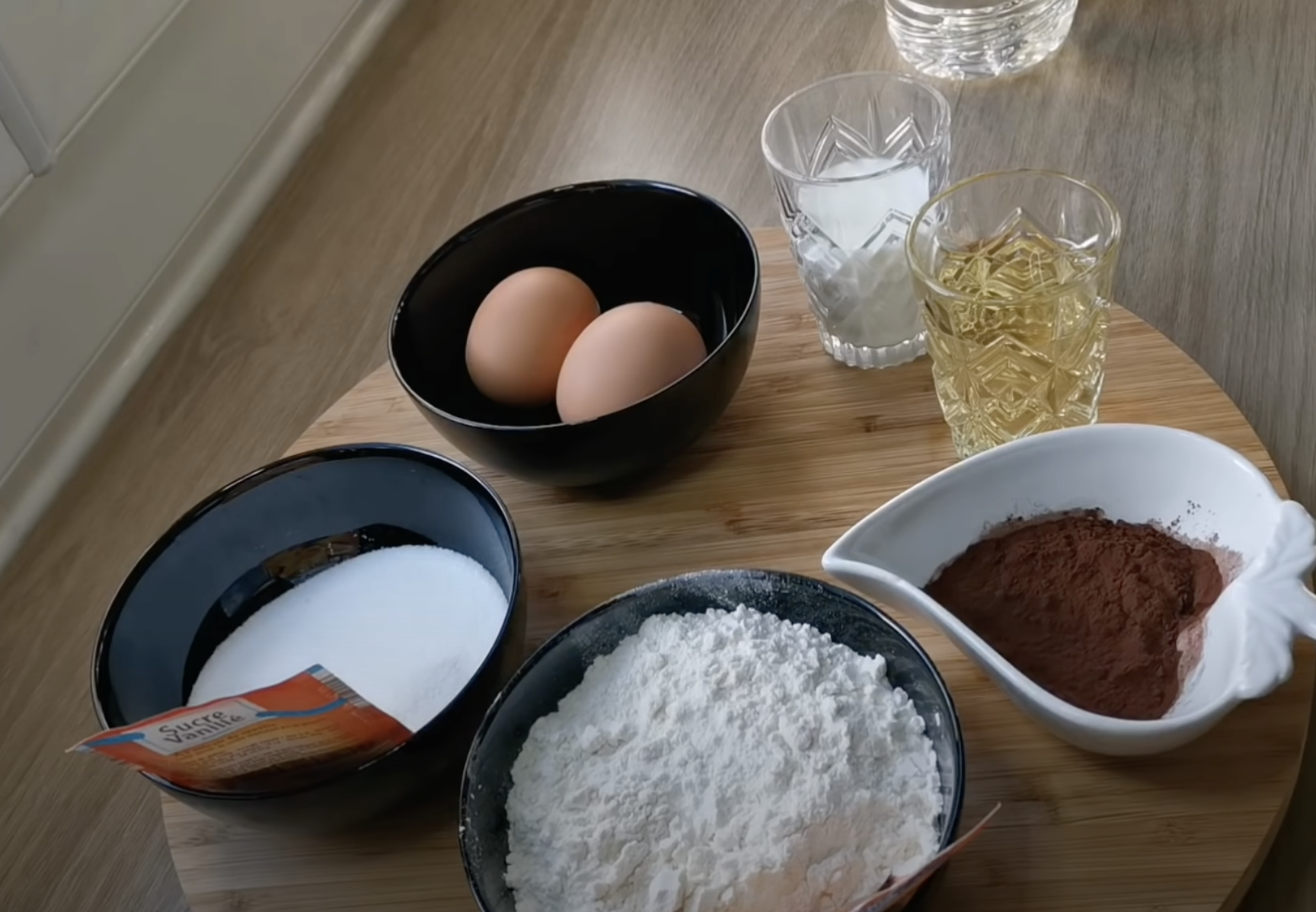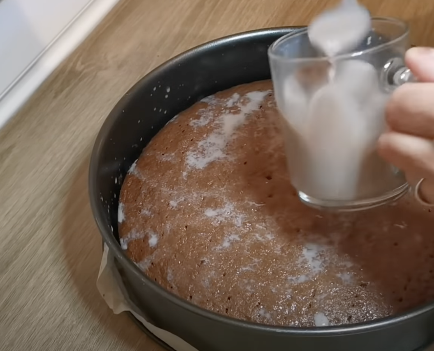 Piecz w 180 stopniach przez około 15 minut. Wymieszaj kakao z gorącym mlekiem. Wyciągnij biszkopt i polej przygotowanym kakao.