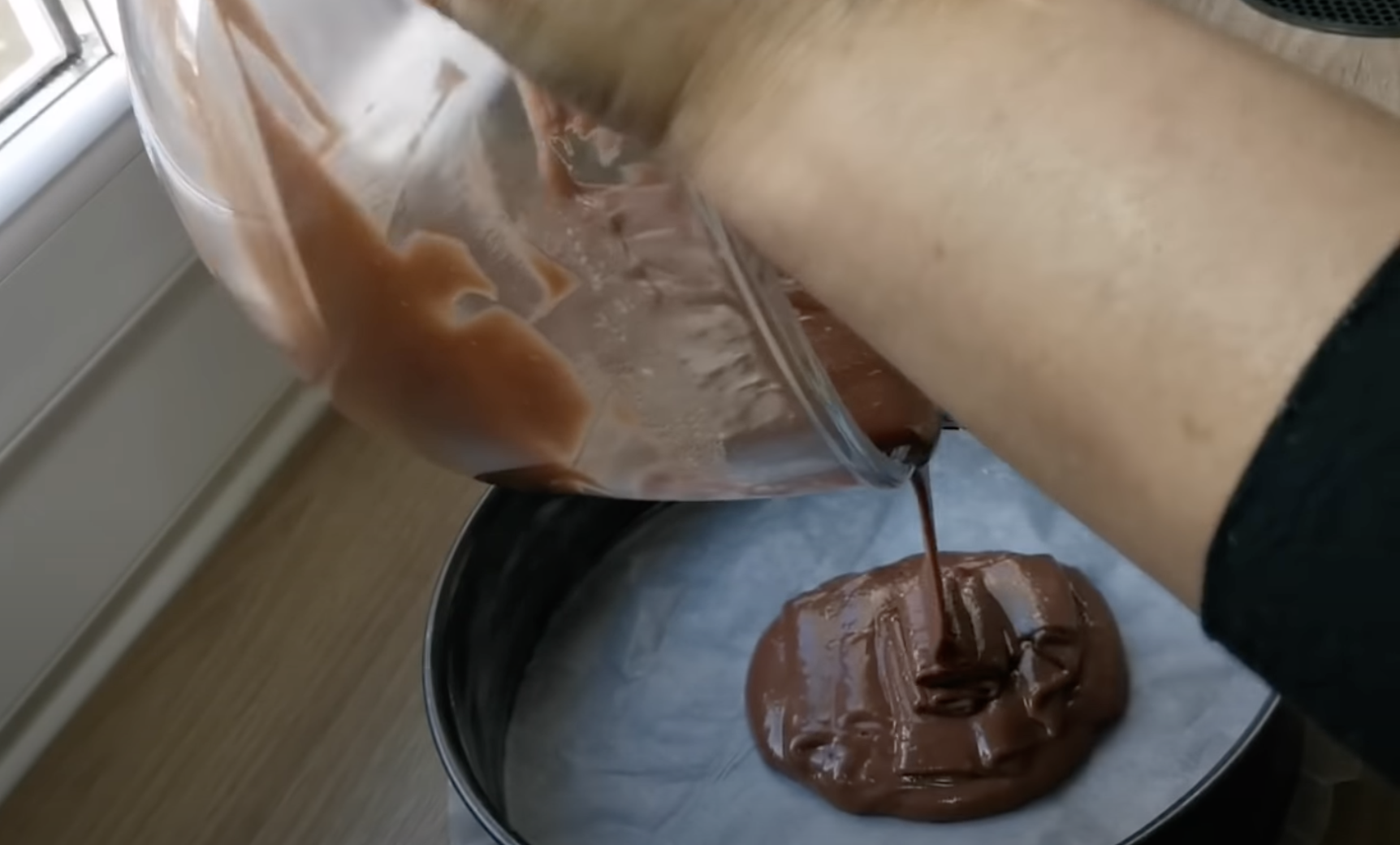 Wlej ciasto do foremki wyłożonej papierem do pieczenia.