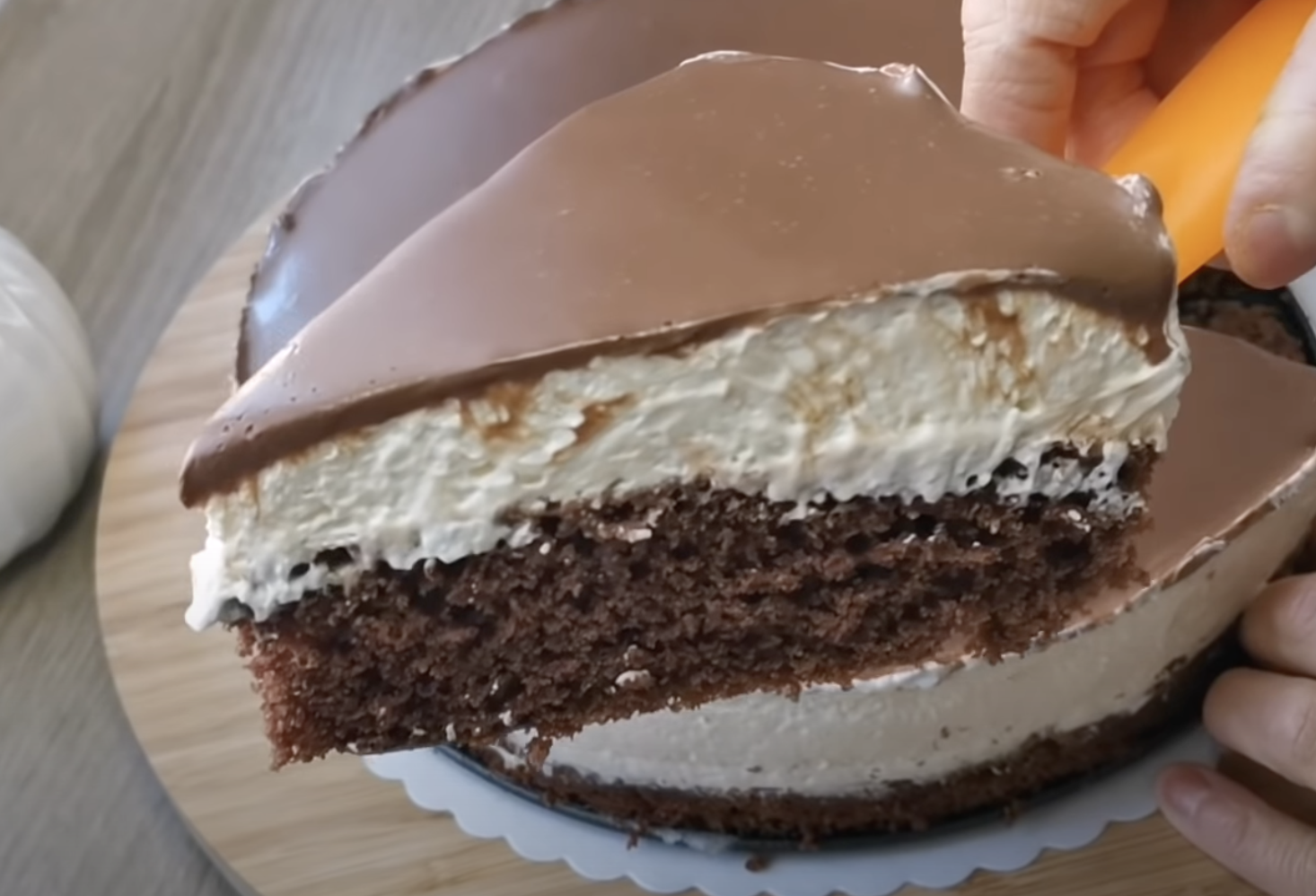Śmietanę ubij z mascarpone i zwykłym cukrem oraz waniliowym. Po ułożeniu śmietany na cieście pozostaw ją w chłodnym miejscu przez 10 minut. Przygotuj polewę. Połam czekoladę i rozpuść ją w gorącej śmietanie. Następnie polej ciasto polewą czekoladową i wstaw do lodówki na 4 godziny.Gotowe.
