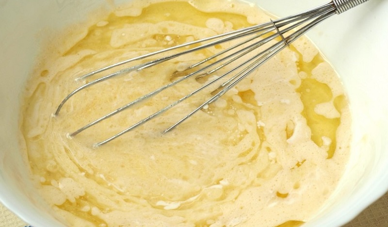 Roztop masło, dodaj cukier i wymieszaj. Pozostaw mieszaninę do ostygnięcia. Dodaj jajka do masła i ubij. Następnie wymieszaj ze śmietaną.