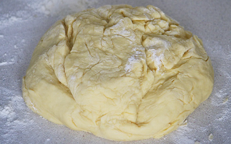 Przesiej mąkę z proszkiem do pieczenia do płynnej mieszanki i ugnieć z niej elastyczne ciasto.