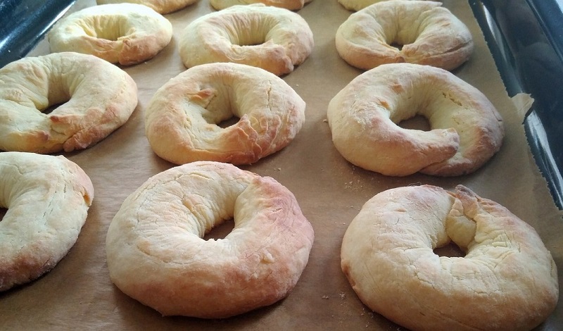 Z ciasta uformuj dość grube ruloniki i złącz je w pierścienie. Ułóż je na natłuszczonej blasze do pieczenia i piecz przez 15 minut w piekarniku rozgrzanym do 180 stopni.